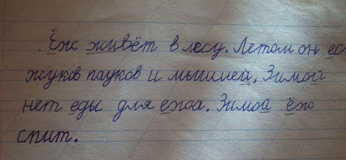 Сочинение про ежа из прописи Маринетт Мортем рассказывает о жизни ежа в лесу. Летом он питается жуками, пауками и мышами, а зимой, когда еды нет, спит. Это сочинение позволяет увидеть, как выглядел почерк Маринетт в начальной школе и как она строила предложения.