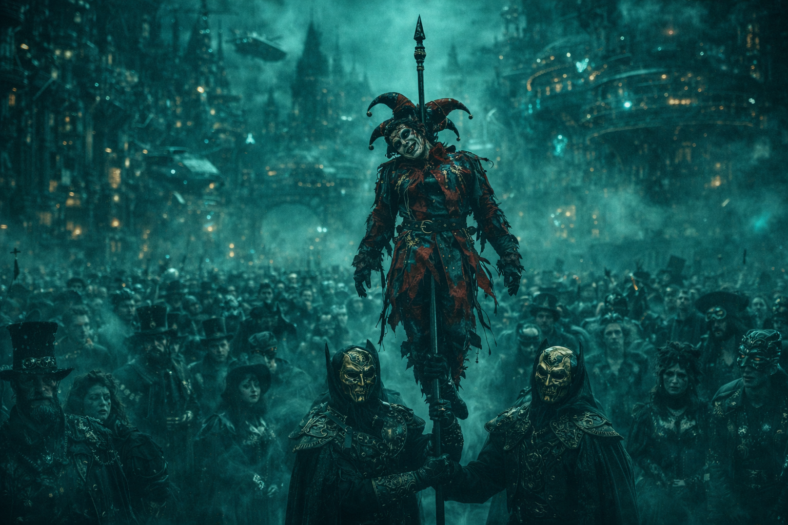 Шут опустился телом на острие. Металл вошёл насквозь, до самой макушки. Раздался влажный звук разрываемой ткани и плоти. Шут не издал ни звука. Он не бился в конвульсиях. Просто раскинул руки, повиснув в воздухе, как чучело.