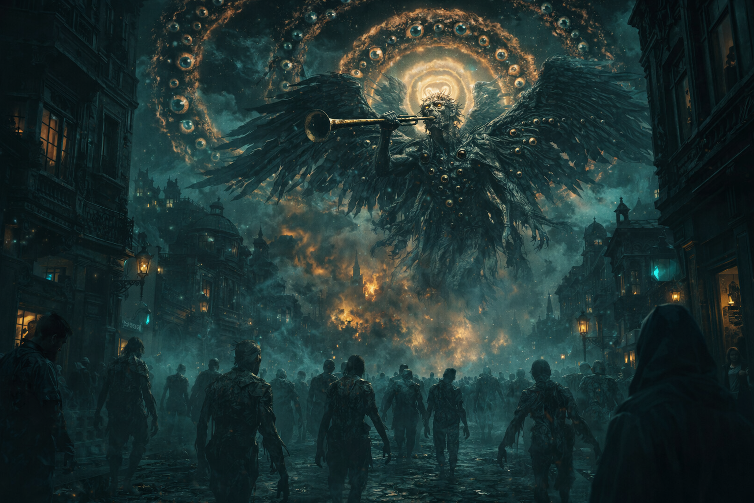 Ангел парил над горящими улицами, в узловатых руках держаа длинную трубу. Он поднёс её к губам, дунул. По пространству прокатилась вибрация, заставляя реальность дрожать.