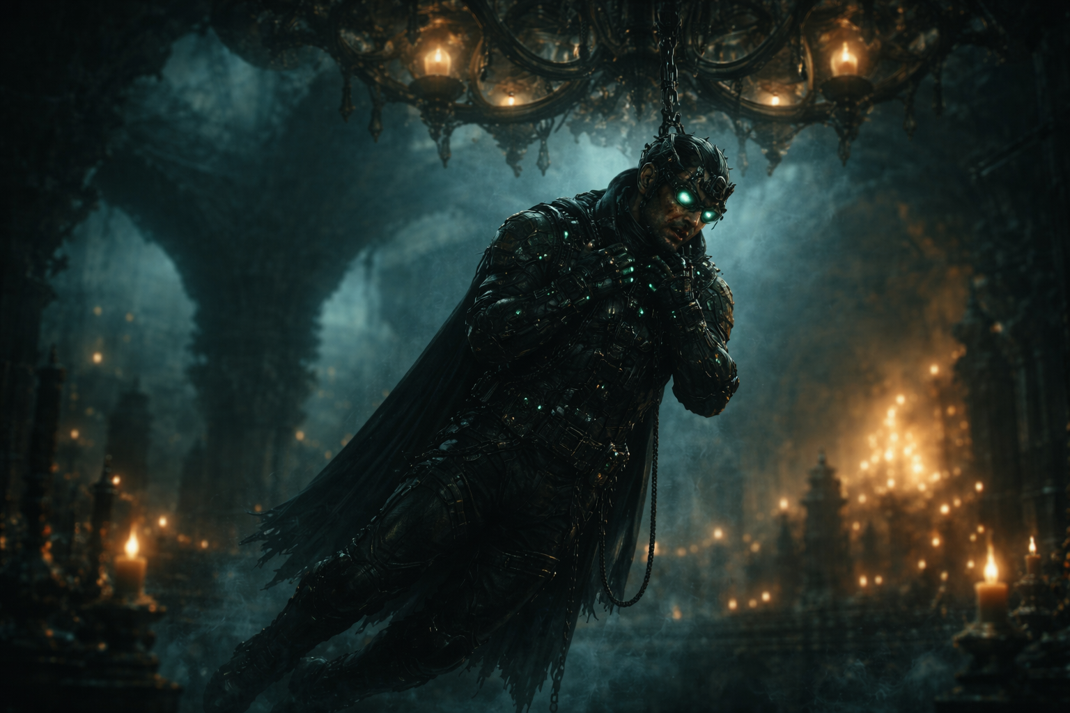 Маг выпустил из своих предплечий прочные кабеля подпрыгнул и зацепился за крюк люстры. Быстрыми, дёргаными движениями он обмотал толстый провод вокруг своей шеи, затянул петлю.