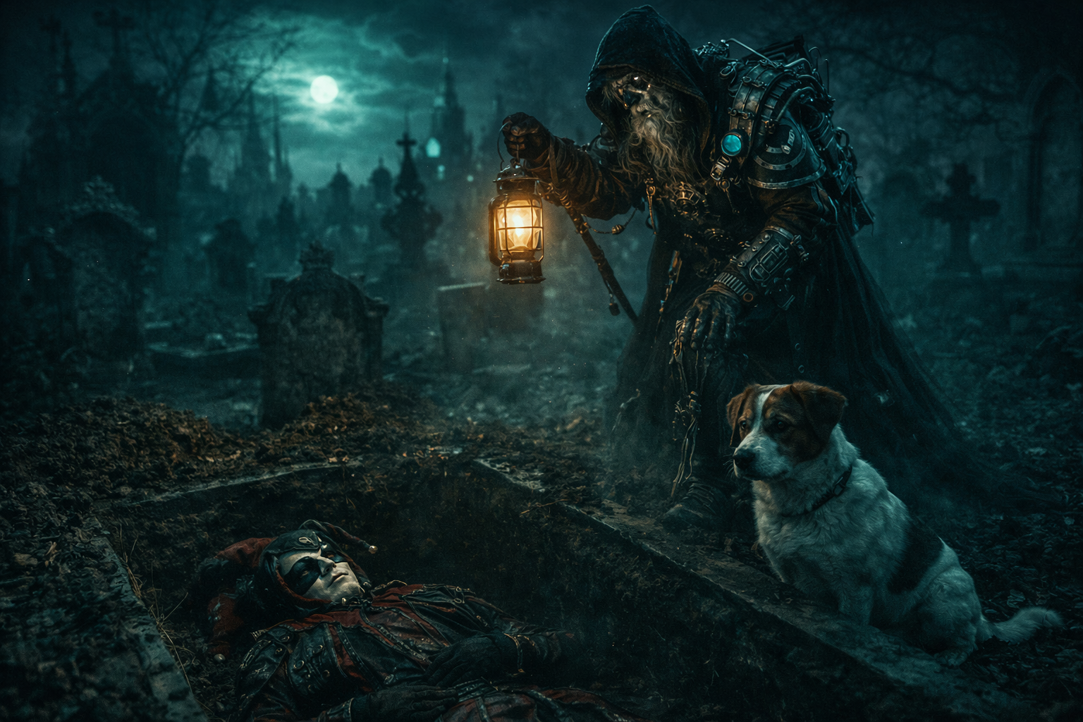 За оградой кладбища, из тени склепа, за ними наблюдал третий — Отшельник — сутулая фигура в лохмотьях, с фонарём, в котором билась пойманная шаровая молния. Он опирался на посох, глядя, как Шута погружают в могилу, но готов был поклясться, что никогда прежде не видел настолько живого мертвеца.
