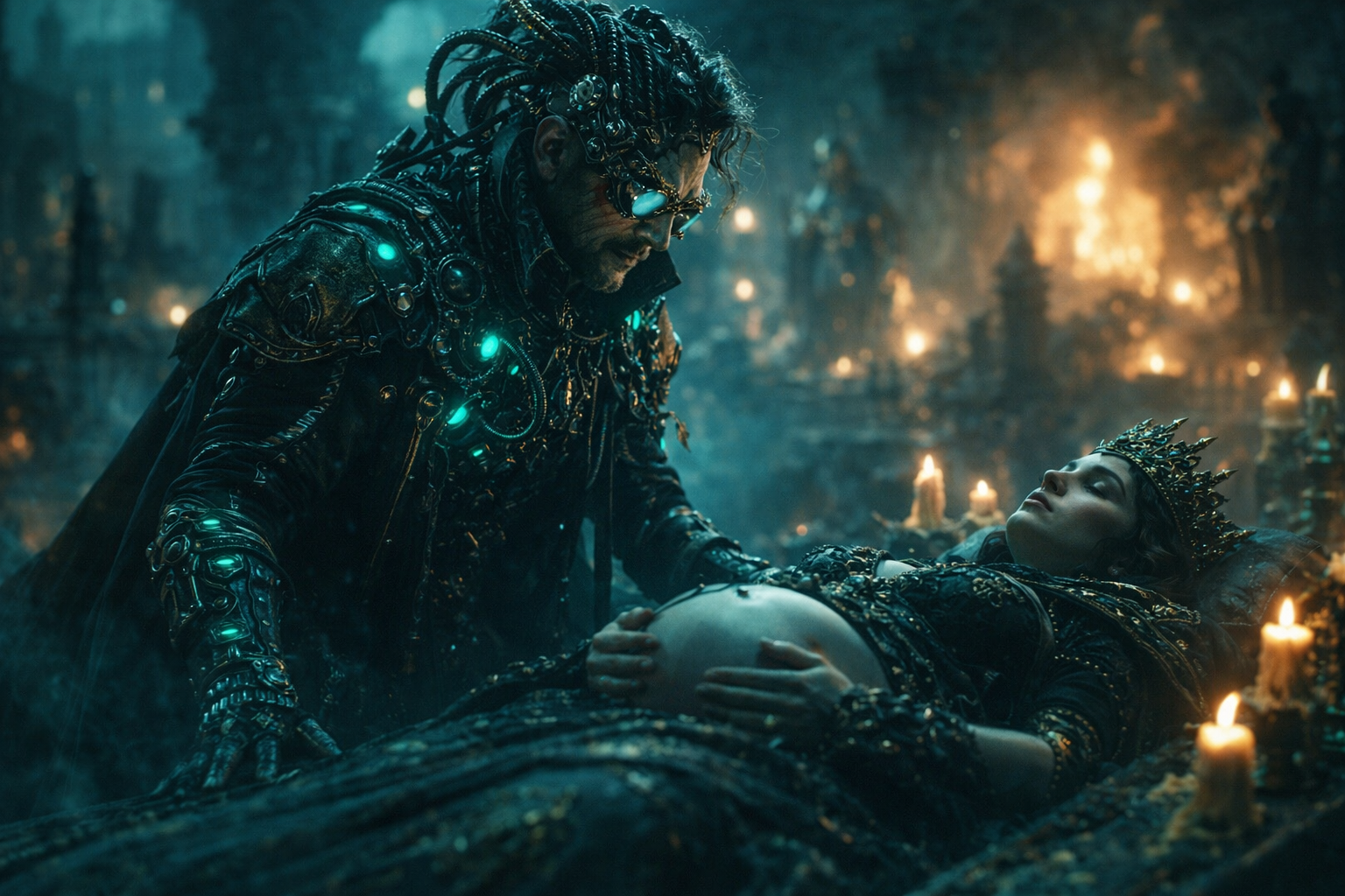 Плач младенца раздался прямо у них в головах, когда в залу вошёл Маг — сын человек и машины. Его торс стягивал корсет из чёрной, грубой кожи, усиленный клёпаным металлом. На поверхности брони, словно вены, пульсировали прозрачные трубки, по которым бежал ядовито-зеленый свет, вот-вот грозящийся погаснуть. Вместо волос с головы свисали тяжёлые, промасленные пучки чёрных кабелей, а глаза скрывали массивные очки с толстыми линзами, которые непрерывно вращались.