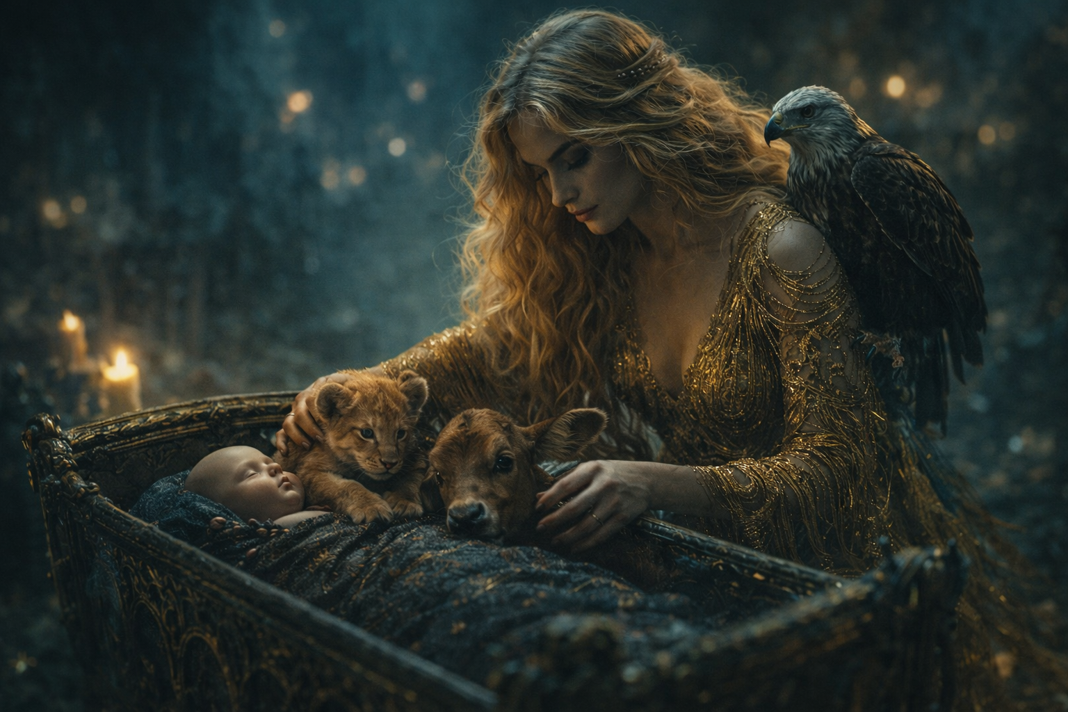 На её плече сидел орлёнок, символ воздуха, рядом с колыбелью, положив лапы на край, лёг золотистый львёнок, символ огня, а с другой стороны к младенцу тянулся мордой телёнок — символ земли.
