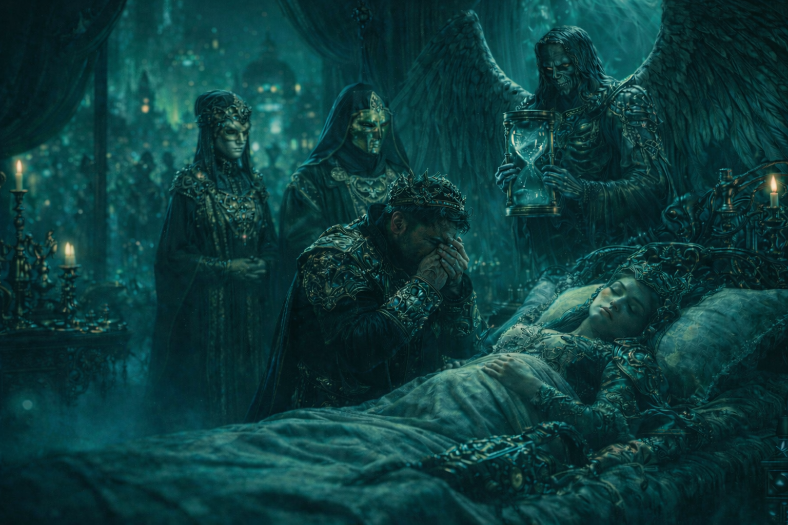 Император сидел над ложем, сгорбившись над умирающей женой.