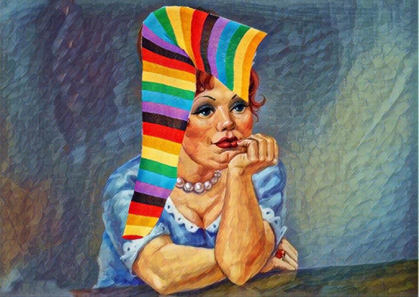 За прилавком сидела пухленькая женщина с очень добрым , круглым , как булочка , лицом . Она сосредоточенно вязала длинный-предлинный полосатый носок . Носок был надет ей... на голову . Полосатый хвост свисал ниже плеча , а четыре спицы торчали прямо из-под него , как антенны .