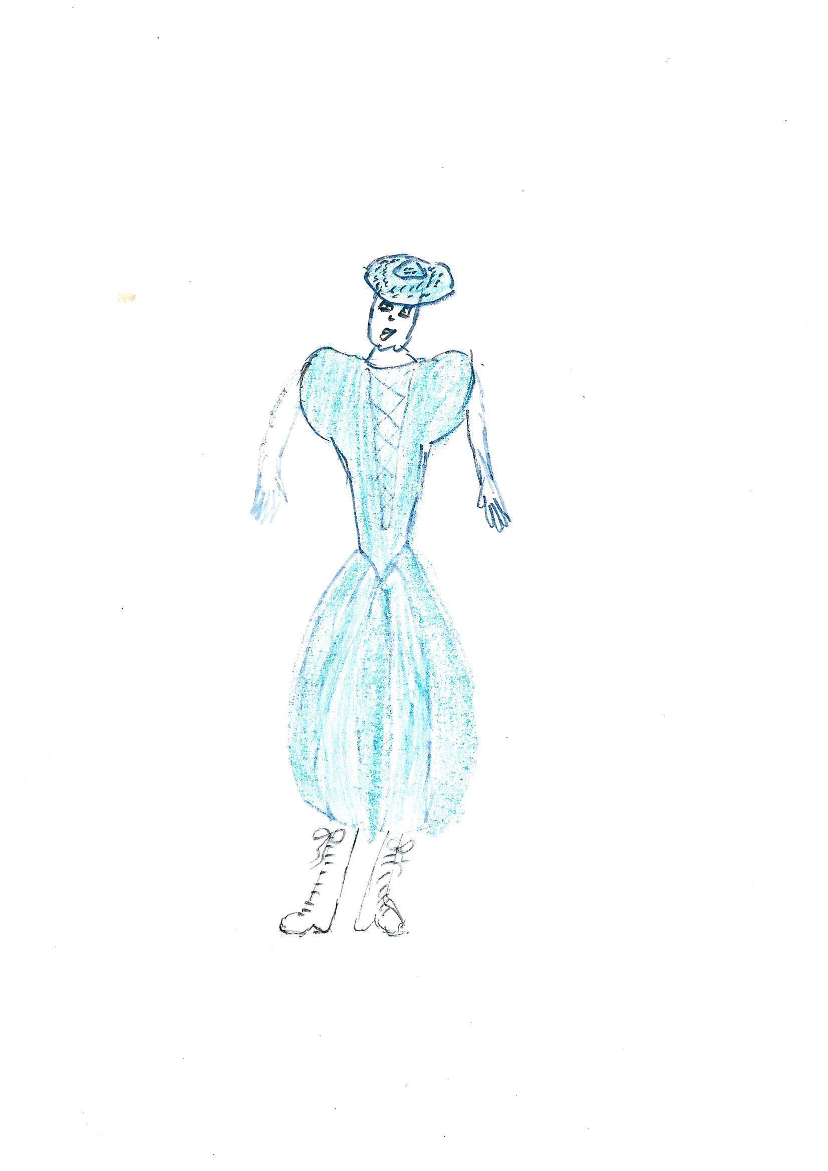 Описание: Фигура в голубом платье с широкими рукавами и широким подолом, сужающимся книзу, напоминает силуэт фонарика. Белые сапоги на шнуровке добавляют образу современности и дерзости. Шляпа с широкими полями завершает наряд, придавая ему изысканности и стиля. Этот образ идеален для тех, кто хочет выделиться на любом мероприятии, сохраняя при этом элегантность и женственность.