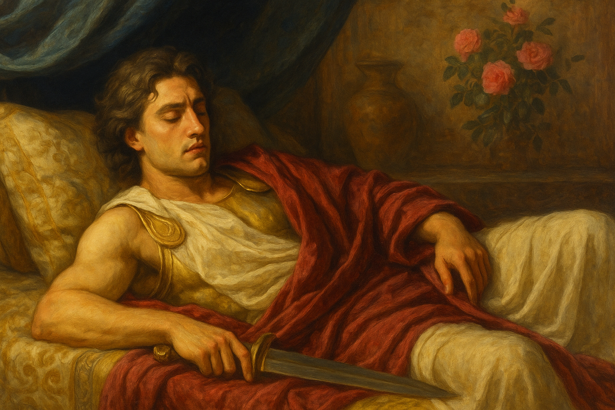 В отражении — не юноша с огнём в глазах, а мужчина в халате, с серьгой. Постаревший, одутловатый от пьянства и разврата. С чужим взглядом.