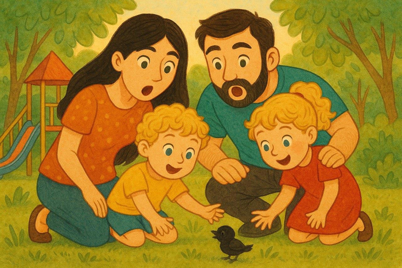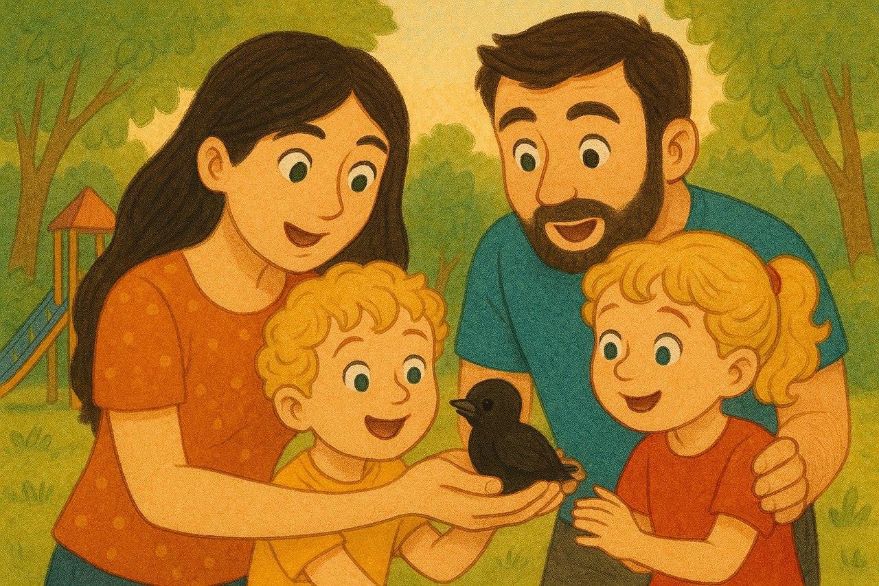 Дети были в невыразимом восторге! Прежде они видели диких животных только в зоопарке и сейчас не могли поверить, что настоящая маленькая дикая птичка находится в руках их папы. Они долго рассматривали птенца, попеременно пугаясь от резко раскрывающегося ярко-жёлтого ротика и гладя по маленькой птичьей головке.