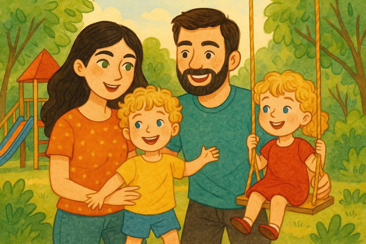 Родители, проснувшись рано утром в шесть утра и собравшись к семи, так как Филипп был настоящим жаворонком, пошли гулять с детьми на удаленную от людей, близкую к парку зеленую площадку. Родители любили гулять здесь, так как она была ограждена забором от дороги с плотным трафиком машин и имела хорошую тень от каштанов, которыми она была плотно засажена.