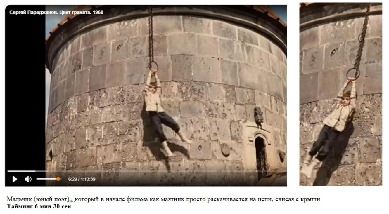 Мальчик (юный поэт), , который в начале фильма как маятник просто раскачивается на цепи свисая с крыши.