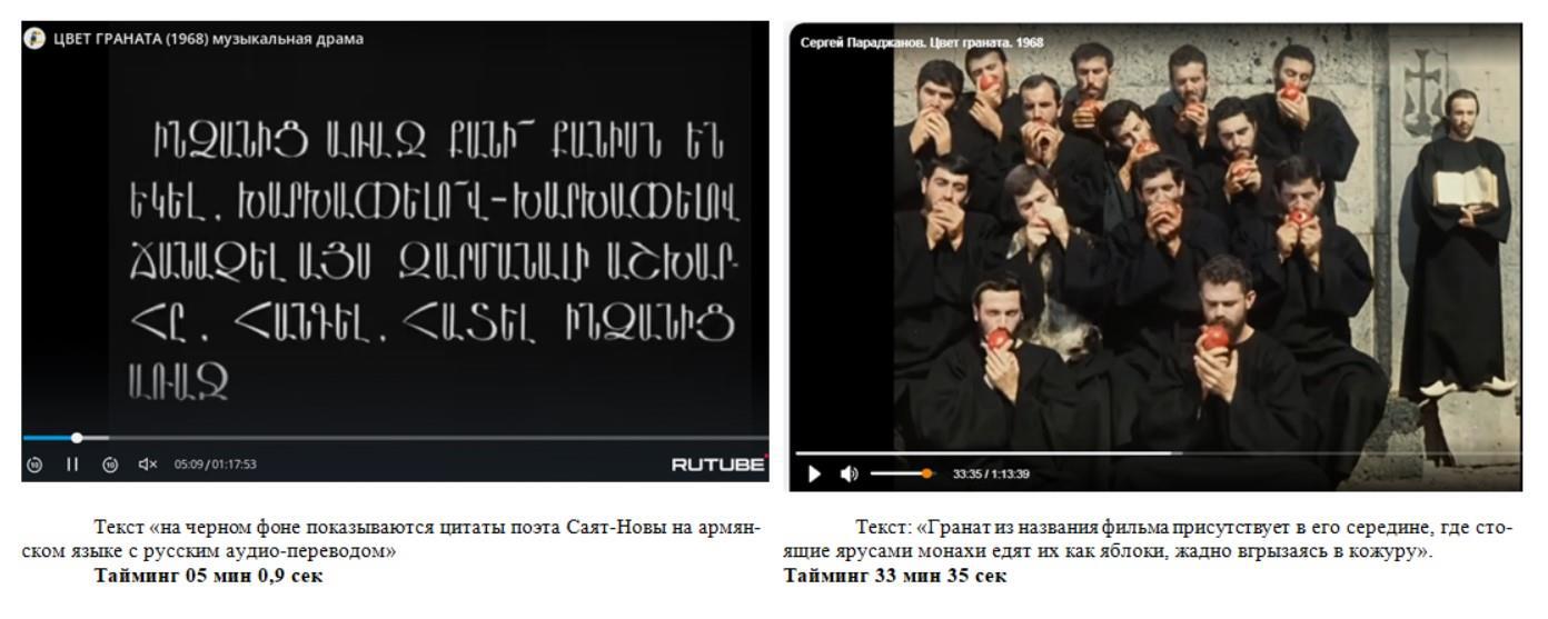 В фильме «Цвет граната» на черном фоне показываются цитаты поэта Саят-Новы на армянском языке с русским аудио-переводом, а затем идет аудио-визуальное отображение разных аспектов и фрагментов его эпохи, показывающих ее через символические действия артистов, напоминающих поэтические манифестации (проявления) сути этих действий. Гранат из названия фильма присутствует в его середине, где стоящие ярусами монахи едят их как яблоки, жадно вгрызаясь в кожуру.