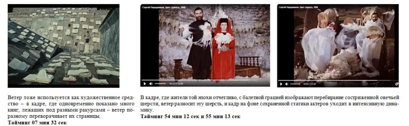 Ветер тоже используется как художественное средство – в кадре, где одновременно показано много книг, лежащих под разными ракурсами – ветер по-разному переворачивает их страницы. В кадре, где жители той эпохи отчетливо, с балетной грацией изображают перебирание состриженной овечьей шерсти, ветер разносит эту шерсть, и кадр на фоне сохраненной статики актеров уходит в интенсивную динамику.