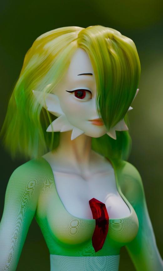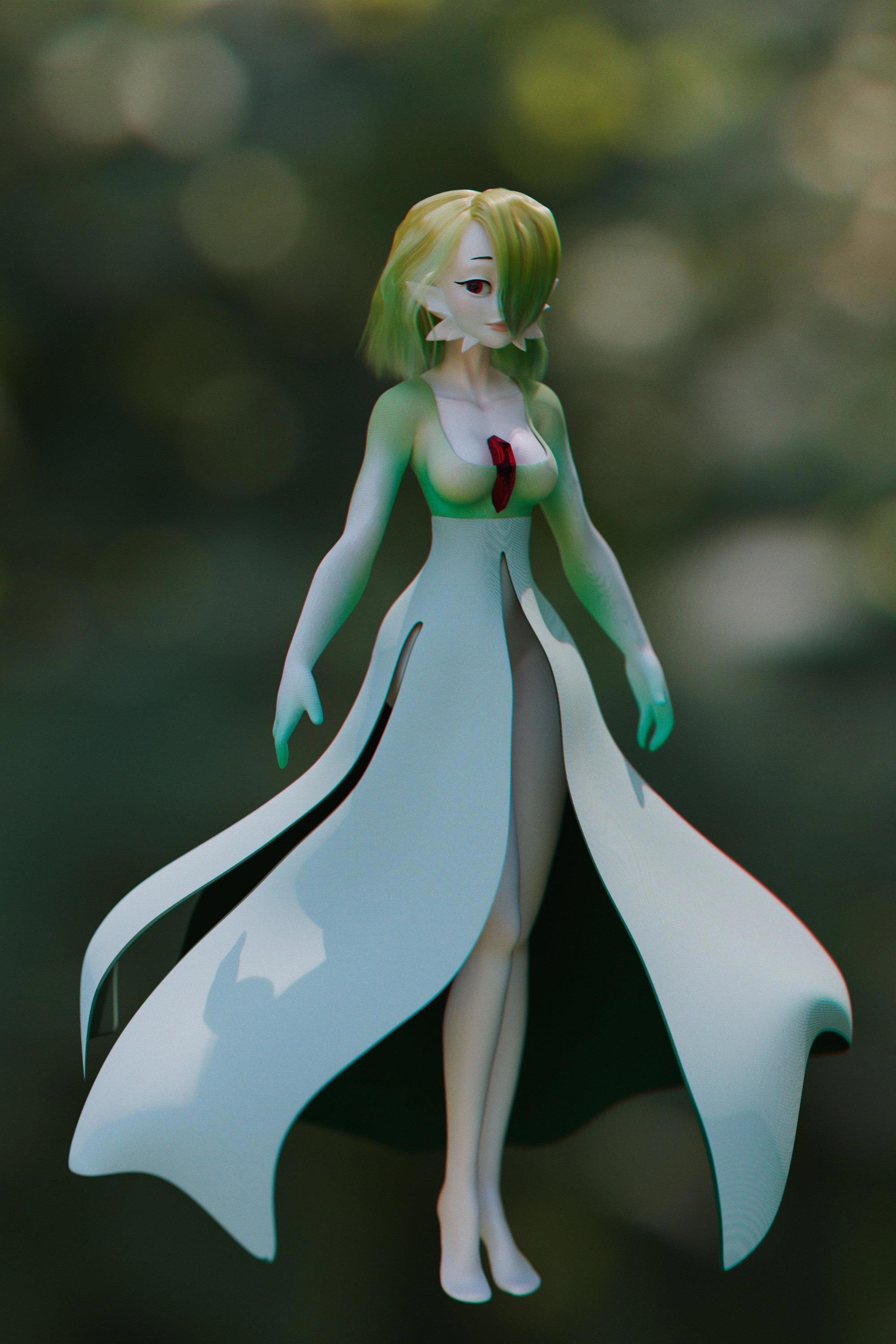 Лесное убранство вокруг можно назвать комфортным. Трава пушистым ковром разлеглась под ногами, не мешает передвижению. Земля не захламлена упавшими стволами, ветвями, пнями, а простирается вдаль, так и прося прогуляться босиком. Травяное покрытие кажется таким уютным. Скидываю обувь и обволакиваю ступни в бархатную поросль. Деревья аккуратно расположены, формируя чётко видимые просеки, никаких неровностей рельефа, только протяжённое мягкое полотно уютной травы. Единственная опасность леса в населяющих его обитателях, здесь каждый зверь таит сверхъестественную угрозу: бабочки могут осыпать пыльцой непонятного состава, гусеницы выпустить луч энергии, птицы взмахом крыльев отбросят воздушной волной, четырёхлапые озорники током ударить или водной, а то и пламенной струёй окатить. Обхожу всех существ, стараясь не тревожить их. Гусеница длиной сантиметров двадцать подняла верхнюю часть продолговатого тела и с интересом смотрит на меня чёрными блестящими бусинками глаз. Громадная птица с пронзительным криком срывается с ветвей, пугая неимоверно. Слышится плач. На опушке сидит его источник: небольшой зверёк на задних лапах, напоминающий суслика, на голову надет череп, в лапах крупная кость. Обхожу его, петляя между деревьями. Взгляду открывается широкая поляна, обрамлённая пышным кустарником с гроздьями розоватых бутонов. Посреди неё существо, будто одетое в развивающееся платье. Подол одеяния колышется, когда существо движется. При этом, удивительное создание не касается земли, а парит на высоте сантиметров пятнадцати. Взгляд одного глаза, второй закрыт ниспадающей до рта бирюзовой шевелюрой, направлен в мою сторону. Трёхпалые руки висят плетьми по бокам, существу не пристало размахивать ими при ходьбе, так как оно лавирует над поверхностью, плавно меняя направление движения. Лицо бледное, похожее на мрамор, по бокам оторочено тремя шипами разной длины и напоминает карнавальную маску. Руки существа похожи на рукава его платья, потому что переходят в подобие бюстгальтера, покрывая нижнюю часть груди зелёными чашечками. Между вполне себе женских молочных желёз торчит осколок, похожий на рубин. Платье запахнуто на поясе, а потом развевается, открывая вполне себе женские ноги того же бледного оттенка, что лицо и грудь. Фигура покемона довольно женственна, а покров, схожий с платьем, только усугубляет это впечатление. Смотрящий на меня левый глаз крупным зрачком схож с каким-то минералом розоватого цвета. Я назвал его оттенок агатовым.