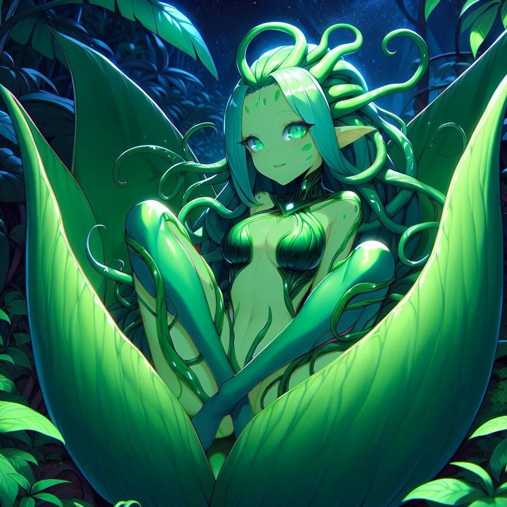 Она сидела в цветке, поджав ноги и опустив голову к коленям. Ее зеленая кожа казалась состоящей из растительных волокон. Хотя почему казалась? Из монстра-цветочка получилась девушка-цветочек.