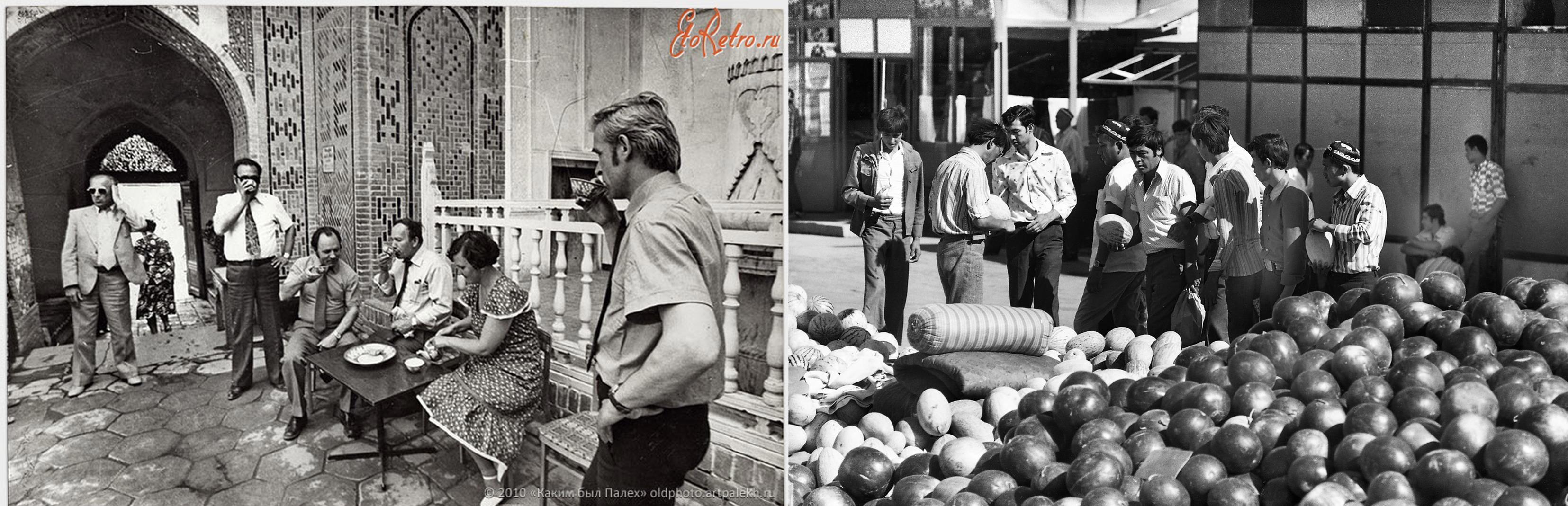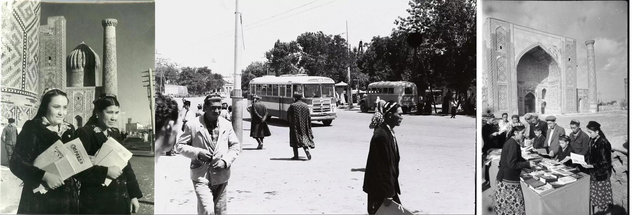 Комсомолки-активистки у стен Регистана. Самарканд, улица Ташкентская. Книжный базар на Регистане.