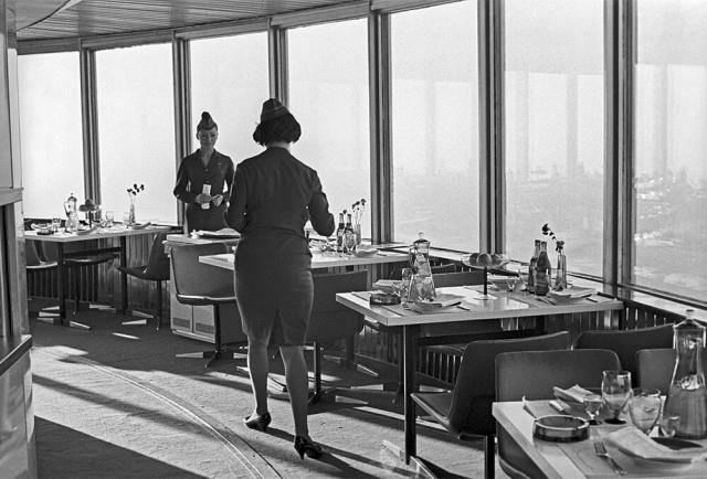 Верхний зал ресторана на высоте 334 метра отделали в тёплой цветовой гамме. Карниз облицевали кованой красной медью, на пол положили тёмно-красное ковровое покрытие. Внутреннюю стену украсили серым мрамором. Его назвали «Бронзовый» зал. В зале среднего этажа потолок и карниз облицевали алюминием с золотым напылением. Ковровое покрытие на полу сделали золотисто-коричневым. Этот зал получил название «Золотой». И, наконец, нижний – самый спокойный по цветовой гамме. Зал расположился на отметке 328 метров. Его потолок и карниз украсили алюминием, а пол – тёмно-серым ковровым покрытием. Внутреннюю стену облицевали белым мрамором. Этот зал стал именоваться «Серебряным». Между собой все помещения связала полукруглая металлическая лестница с мраморными ступеньками. Каждый из ресторанов совершает круговые движения вокруг своей оси. И это впечатляет.