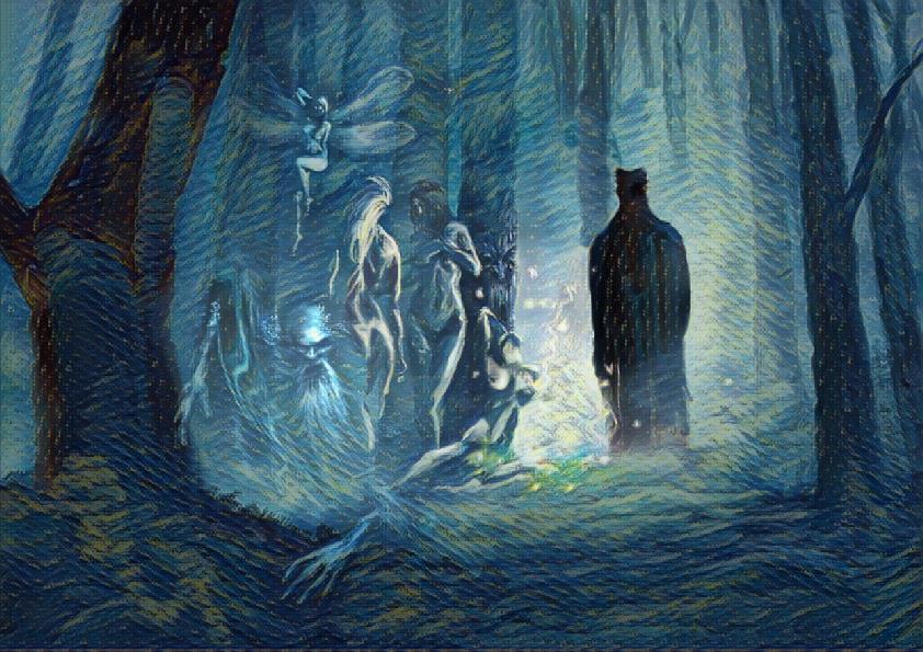 И вот , в лунную ночь , с тремя трофеями Железный Лесоруб встал на лесной поляне , воткнул посох в землю , и окропил вокруг водой из флакона . Тогда вдруг тени зашевелились и сложились в высокую , тонкую фигуру . Лесной Холостяк не был страшен , но он был бесконечно печален . Кожа на его лице напоминала кору старой берёзы , а глаза — два глубоких лесных озера , полные одиночества из-за отражавшейся в них луны .