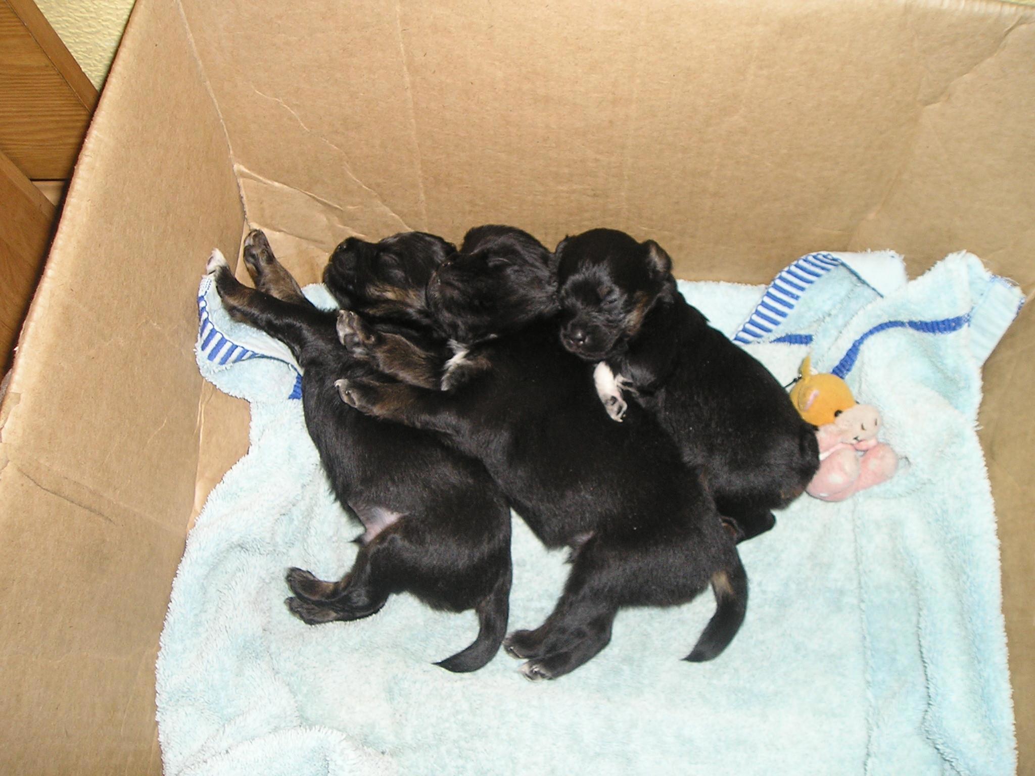 Ну ладно! Раз ей так удобно! Я не стала спорить. Она, бедняжка, очень сильно мучилась. На это невозможно было смотреть. Но она не давала мне никуда уходить. Скулила и не пускала. Мне пришлось стоически это все выдержать. Я ее гладила и успокаивала. И она справилась! В течении нескольких часов, она родила трех одинаковых черненьких щенков! Все убрала за собой. И уютно устроилась в коробке. Щенки лежали чистенькие и чуть попискивали, как мышата. Она счастливая заискивающе смотрела на меня, словно говоря: