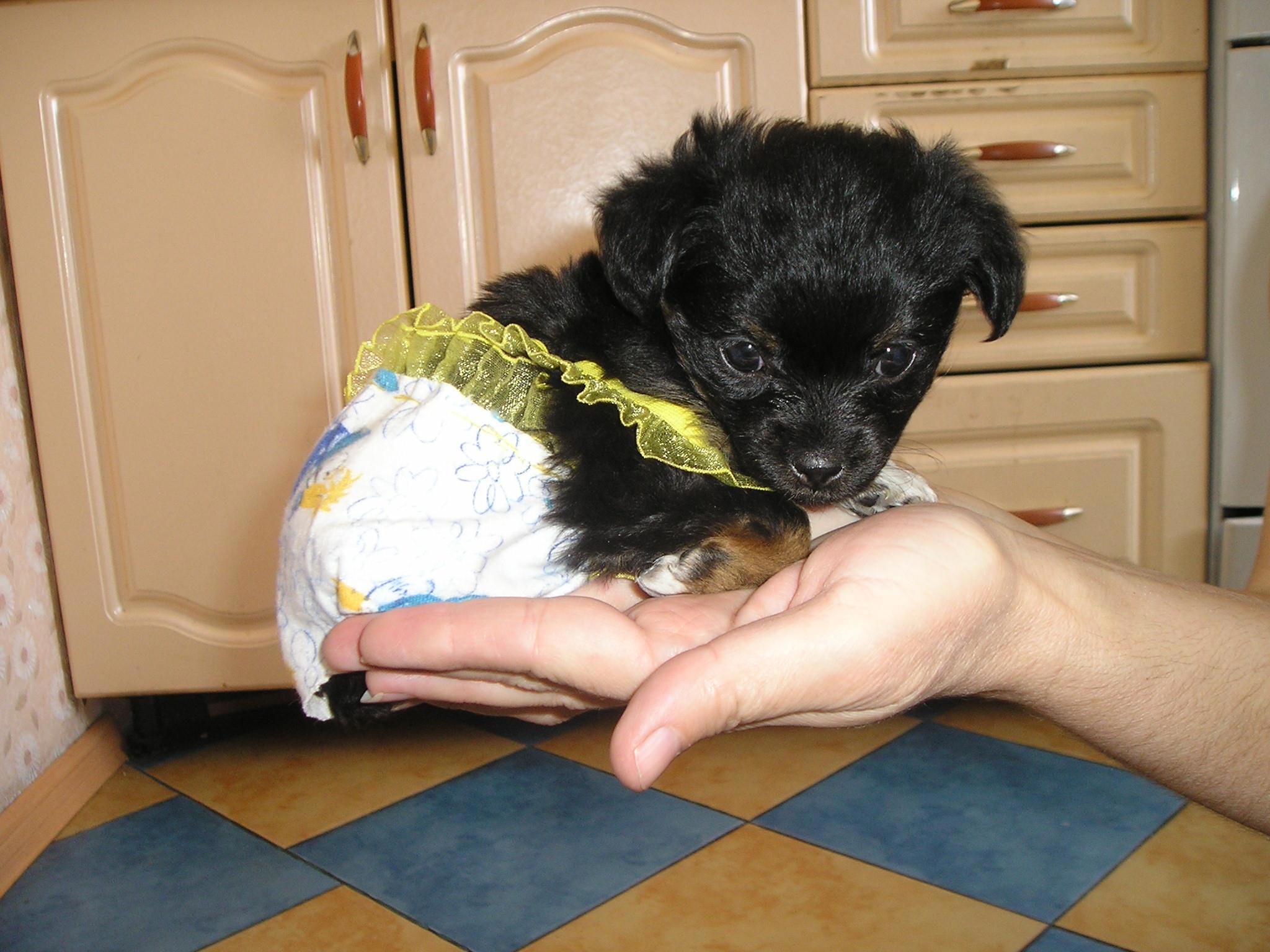 Долго ждать не пришлось. Поужинали, поговорили-посмеялись. И вдруг раз! Старшая дочь выходит из комнаты и возвращается, неся в руке собачку. Размер собачки просто с ладошку! Ей, видимо, еще и месяца не было.