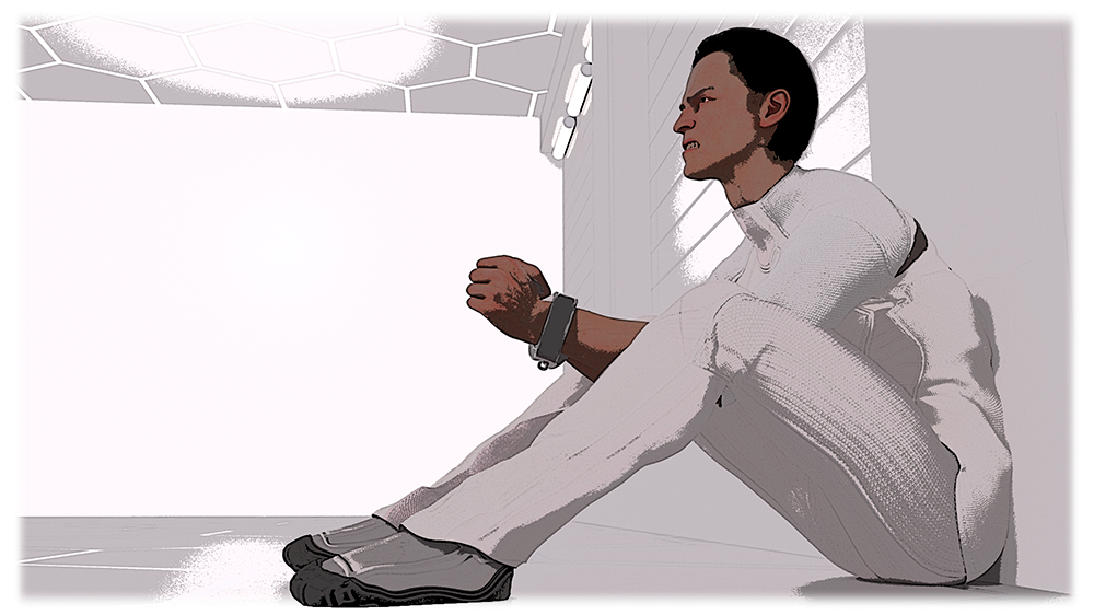 Ведь он собственноручно раздал сотрясения головного мозга трём мужикам в голубых комбинезонах. А после того, как он убил ложкой «психиатра», что показывал ему картинки на планшете и тыкал в голографический экран, его запихнули сюда и проводят свои исследования, только когда вырубят Евгения каким-то газом, что выходит у самого потолка.