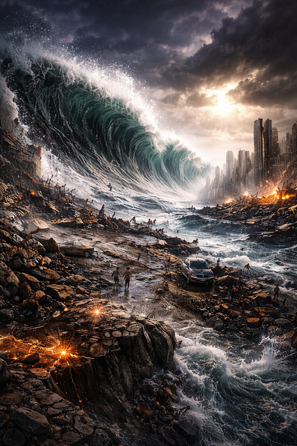 Так ещё и метеоритный дождь породил большие пожары по всей Земле ,Цунами что достигали до 30 метров и сметали прибрежные города ,не меньшей катастрофой были и сильные землетрясения амплитудой от 5 до 9 баллов меняя ландшафт .Мир пошёл медным тазом содрогаясь,горя,тонув, уничтожая города и следы человеческой деятельности .Какой это был удар для человечества и говорить не стоит,в двух словах : Большой Пиздец