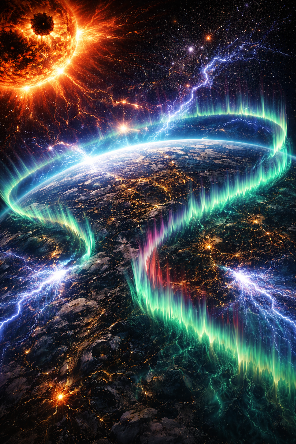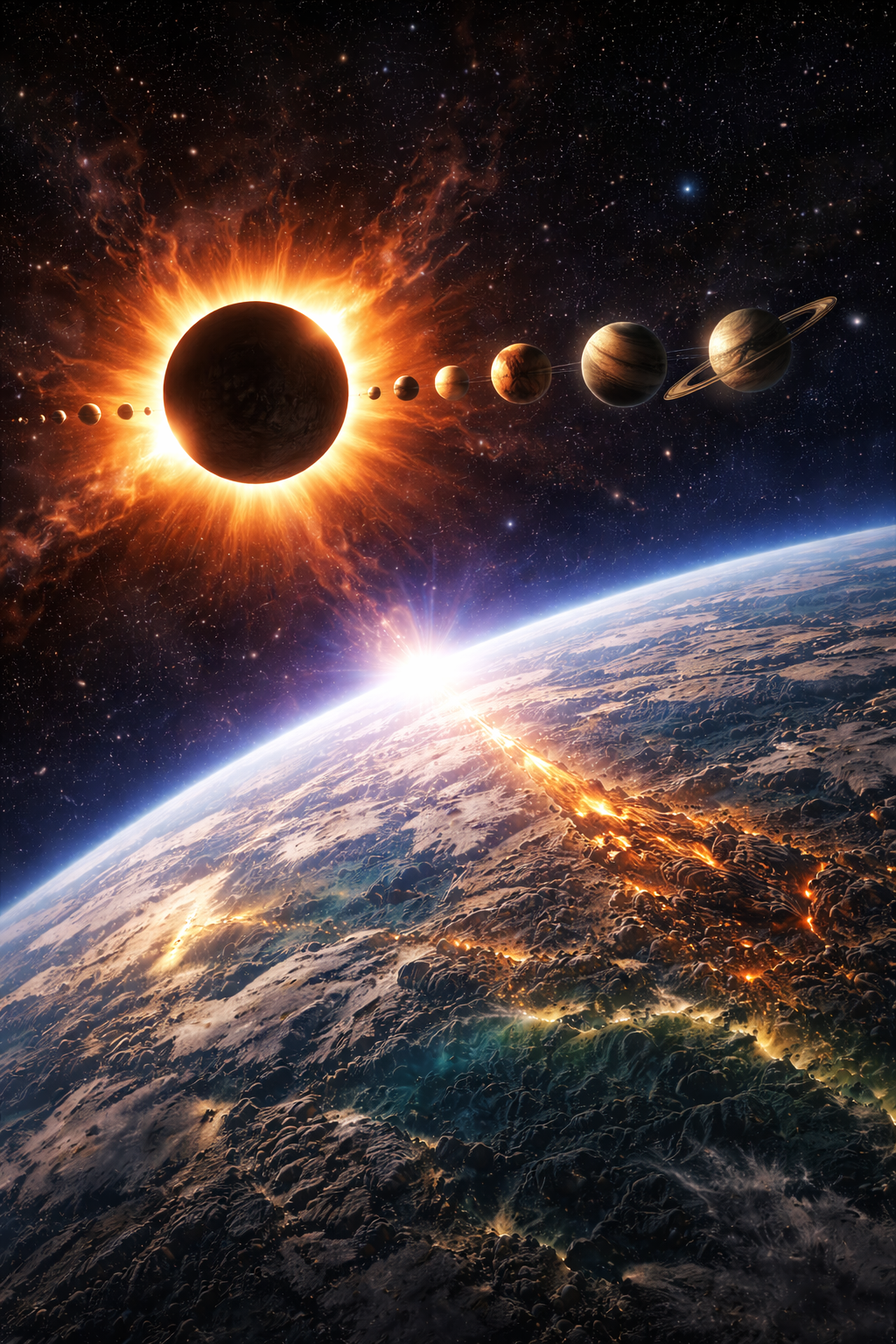 В это время повысилась температура на +5° и усилилась волны исходящие от солнца вызывая сильные магнитные бури .Сильная солнечная буря вызвала сбой в магнитосфере Земли,а произошедшее дальше потрясло небеса буквально . Планеты в Солнечной системе выстраивались в ряд как по расписанию Парада Планет,так ещё и в тот день было солнечное затмение.Вид был завораживающим вызывая щепотку страха и содрогания.