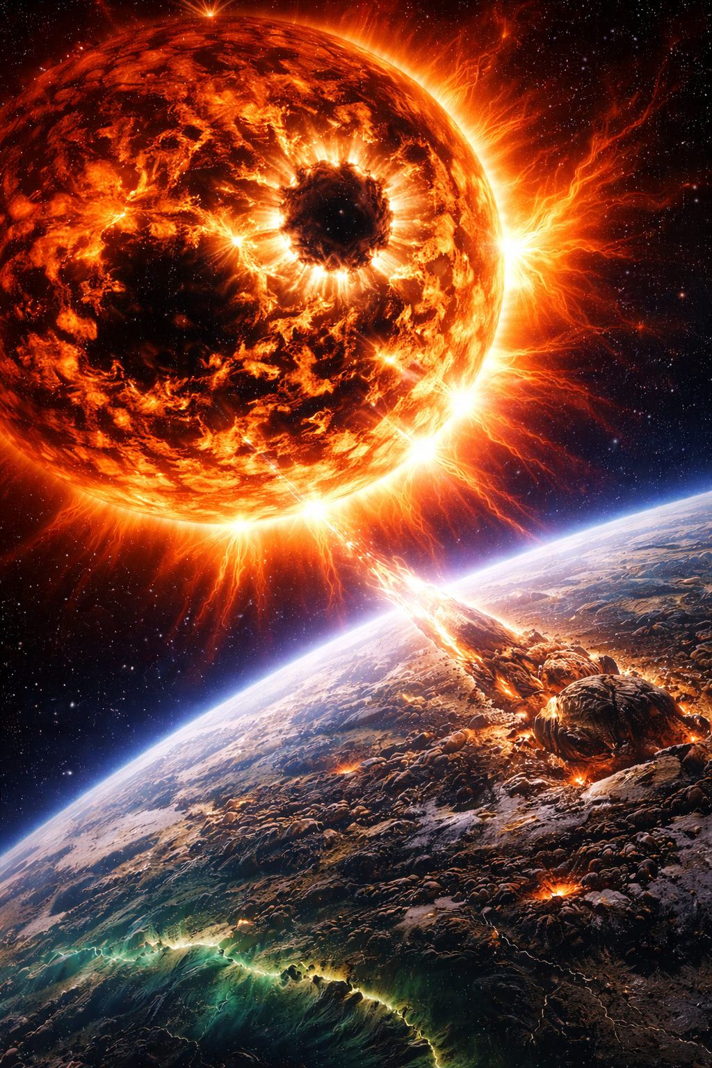 Началось всё незадолго до дня ,, Х " когда на Солнце появились чёрные пятна на поверхности и реакция учёных не заставила себя ждать .Происходило это постепенно ,тем временем на Солнце появились и другие подобные пятна и становясь больше по масштабам ,пока не остановилось на размерах с футбольные стадионы .
