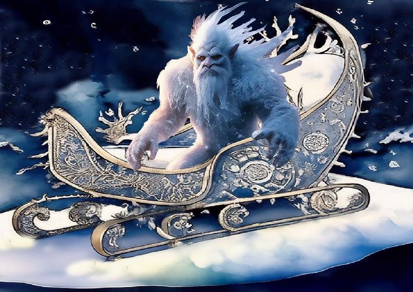 Вдруг вокруг потемнело , и посыпались хлопья крупного , колючего снега . И это не просто метель началась . Это по свинцовым тучам мчались сани , запряжённые парой мохнатых вьюг . А в санях восседал сам Снежный Тролль , старый и страшный . Шуба на нём была из инея , борода из сосулек , а глаза — как две промёрзшие луны .