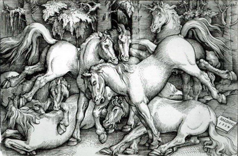 А еще Бальдунг любил изображать лошадей. И я его в этом вполне понимаю, хотя получалось у Бальдунга далеко не всегда. Одно дело изобразить лошадь в покое — просто стоит. Но совсем другое изобразить единоборство лошадей. Как, по-вашему, что сделал Бальдунг?