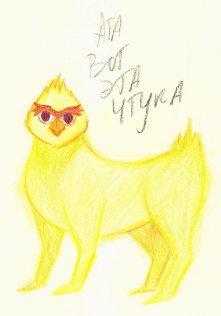 Этот персонаж выглядит необычно и сюрреалистично благодаря своей голове с ярко-жёлтым оперением, напоминающим голову цыплёнка, и телу, покрытому мягким жёлтым пухом, как у коровы. У него отсутствуют крылья, а хвост заканчивается пушистыми жёлтыми перышками. Брови этого существа всегда нахмурены, что придаёт ему задумчивый и загадочный вид. Эта разновидность ципляьей коровы смотрит тревожно, с недоумением, серьезно и как будто бы с недоверием. Свирепость отсутствует, и то хорошо уже. Но вряд ли эта птичка даст возможность на себе прокатиться...