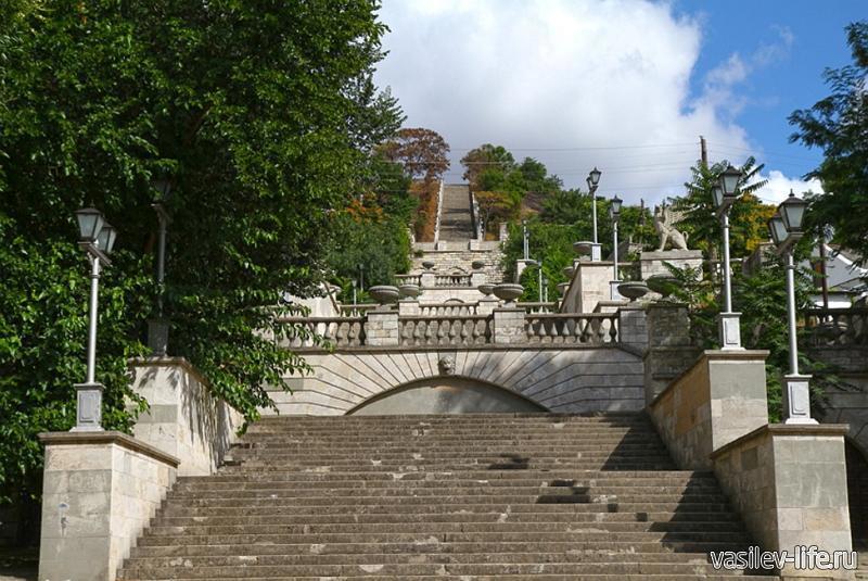 Сразу от церкви к вершине горы Митридат вела Большая Митридатская лестница с балюстрадами, полуколоннами и прочими архитектурными украшениями. У начала лестницы расположились каменные грифоны. Вспомнил, что грифон является геральдическим символом Керчи.