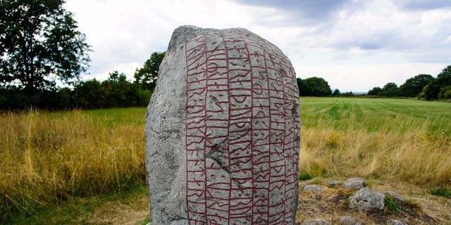 Ниже представлен так называемый Карлевский камень (конец X века) — древнейший случай записи древнескандинавской скальдической строфы (висы) в особом размере dróttkvæt. Камень был воздвигнут для прославления Сибби, воина и путешественника, который либо сам был датчанином, либо погиб в датских водах.