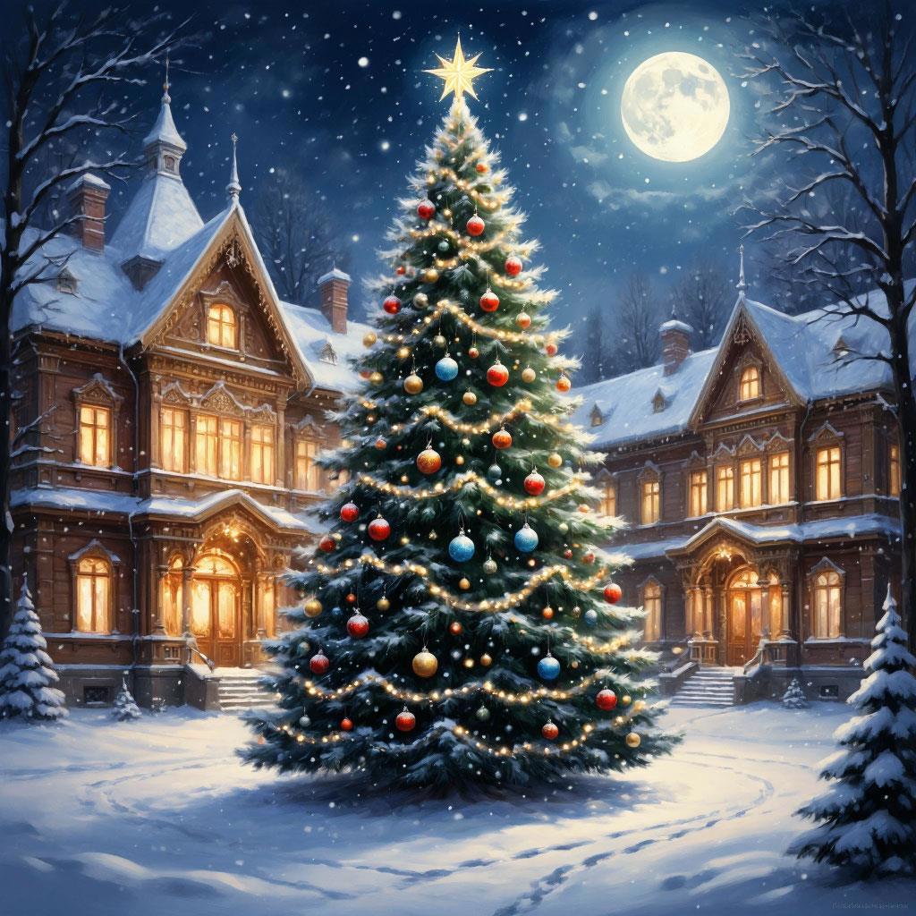 В заснеженном дворе княжеского дома, окутанного мягким лунным светом, зажглась яркими магическими огнями величественная ель. Сверкающие огоньки рассыпались по ее пушистым ветвям и мерцали словно сотни маленьких звезд, переливались в хрустальных шарах и блестящих подвесках, отражая и множа разноцветные блики.