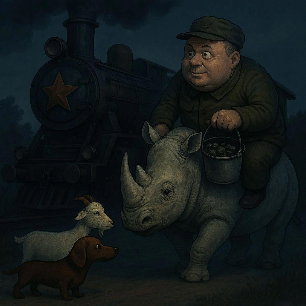 Из темноты вышел силуэт. Круглый, пузатый, с ведром, в котором что-то звякало, как философия на болоте. Рядом с ним — белое существо. Огромное, медленно идущее, будто его катит не судьба, а смирение. На голове у пузатого была шапка с оторванной кокардой, на груди — пятно в форме континента, который никто уже не мог вспомнить.