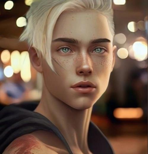 Отличительные черты: блондин, волосы короткие; нос с горбинкой; глаза зеленые; крупное красное родимое пятно на плече.