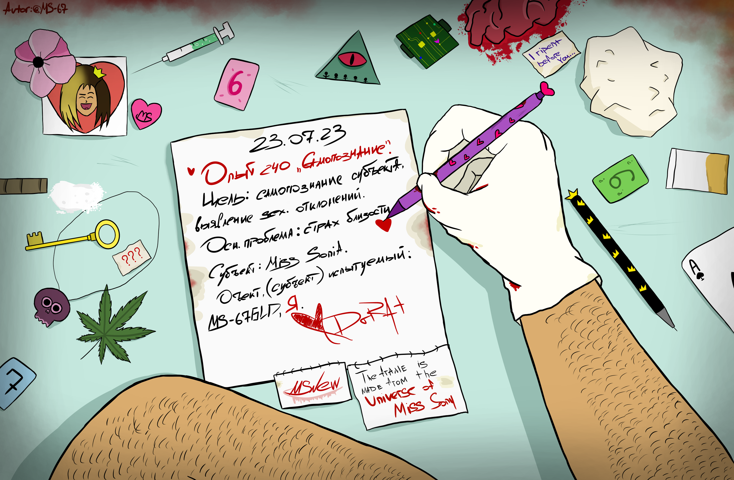 Осмотревшись, Я заметил, что лежу на койке, стоящей посреди комнаты. Слева от меня стояла еще одна койка, на стене над которой висела неоновая желтая вывеска "MS" и были развешаны какие-то рисунки. Видимо, эта койка принадлежала моему параллельному двойнику, обитающему в этом мире. Справа от меня находился стол с радарами, а слева от него была дверь, ведущая, как Я догадался, в некий клуб. Эта лаборатория оказалась невероятно разнообразной — здесь было все: клуб, лаборатория, больница, спортзал, комната с чистым источником, даже выставка с измученными людьми, над которыми, похоже, проводили эксперименты.