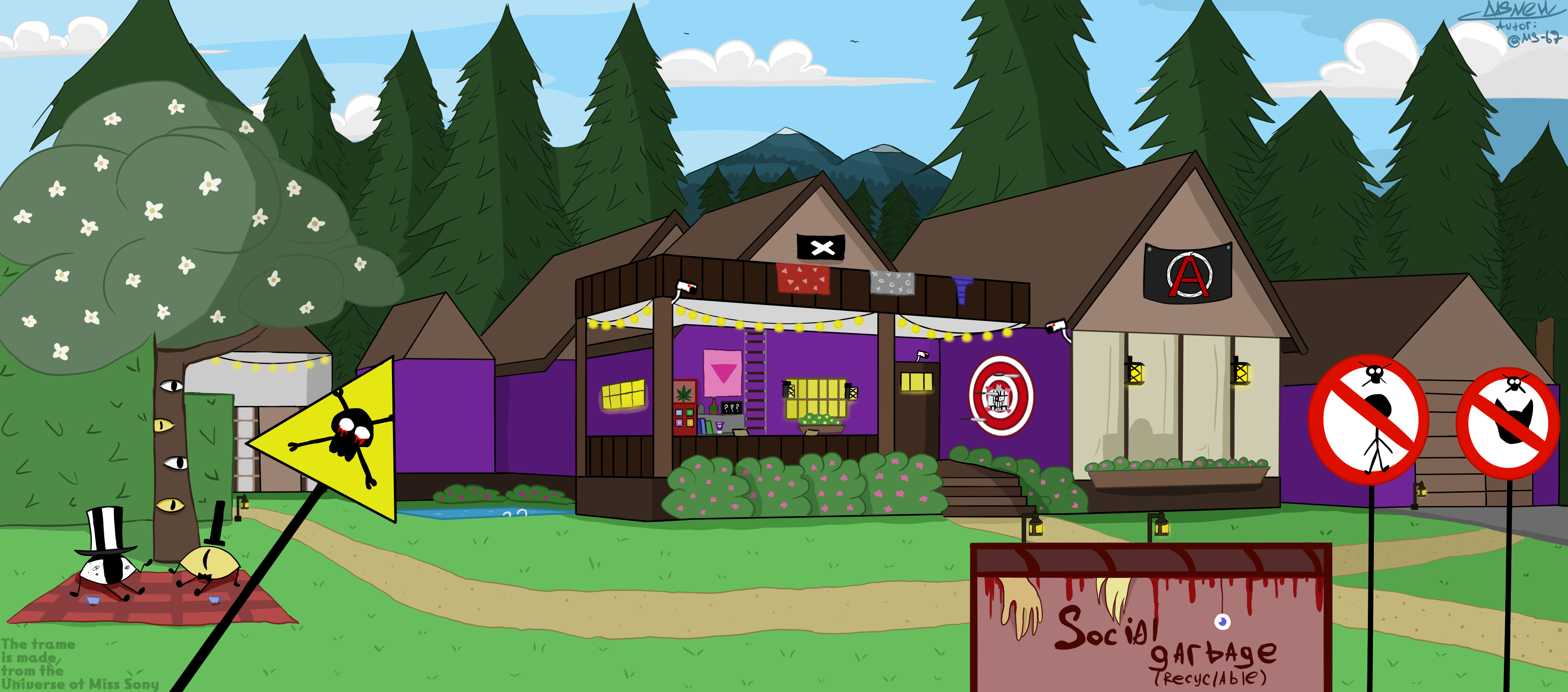 По всей видимости, местность, в которую Я попал, была тайгой, причем не самой глубокой её частью, поскольку, повернув голову в правую сторону, Я увидел, что за деревьями скрывается фиолетовый дом. Этот дом, казалось, состоял из множества маленьких домиков, разделенных коричневыми крышами.