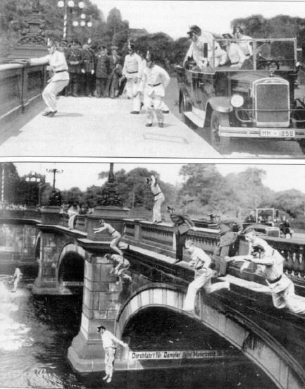 Сотрудники ОрПо тренируются спасать тонущего, прыгая с моста.