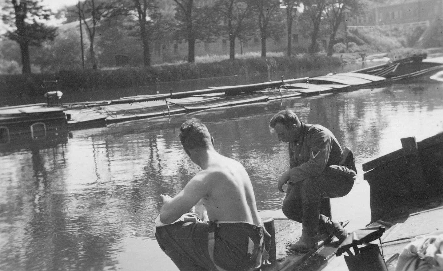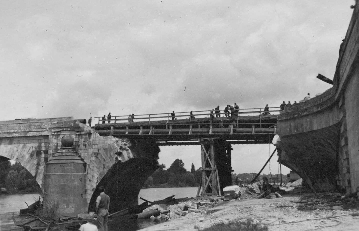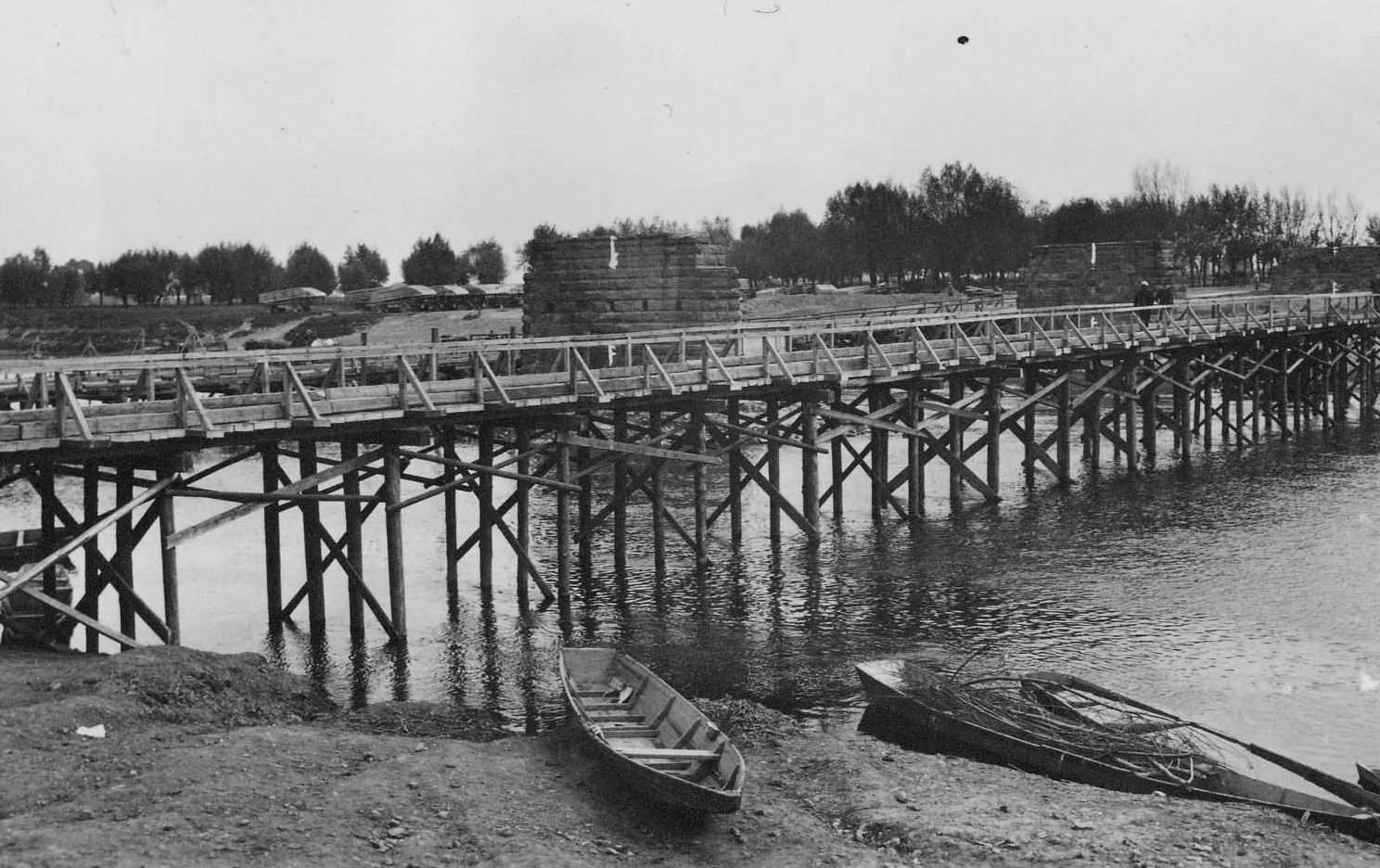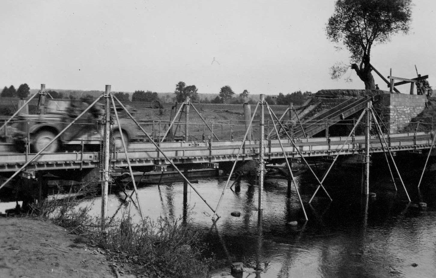 Мост, построенный немецкими сапёрами вместо уничтоженного, чьи быки видны на заднем плане.