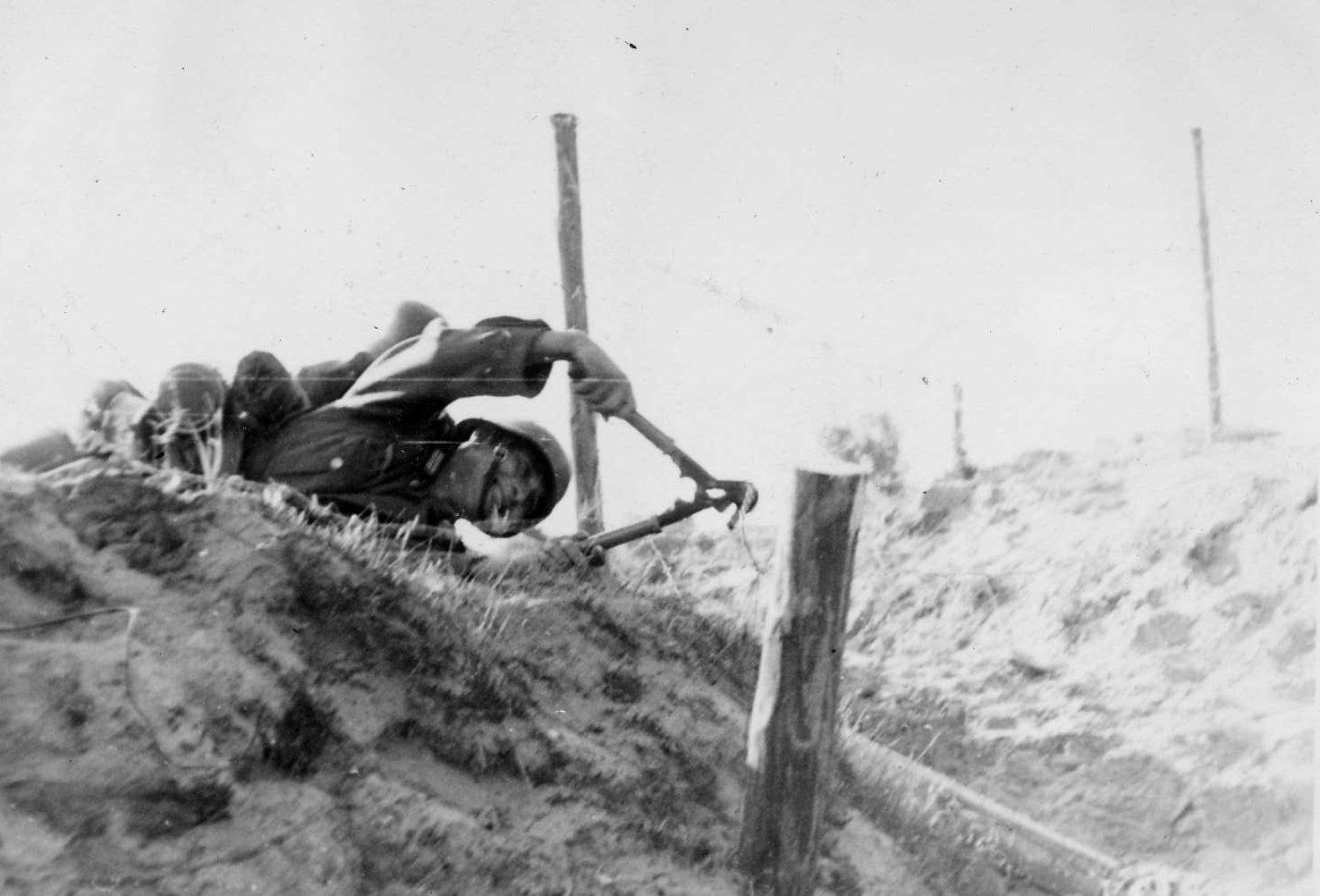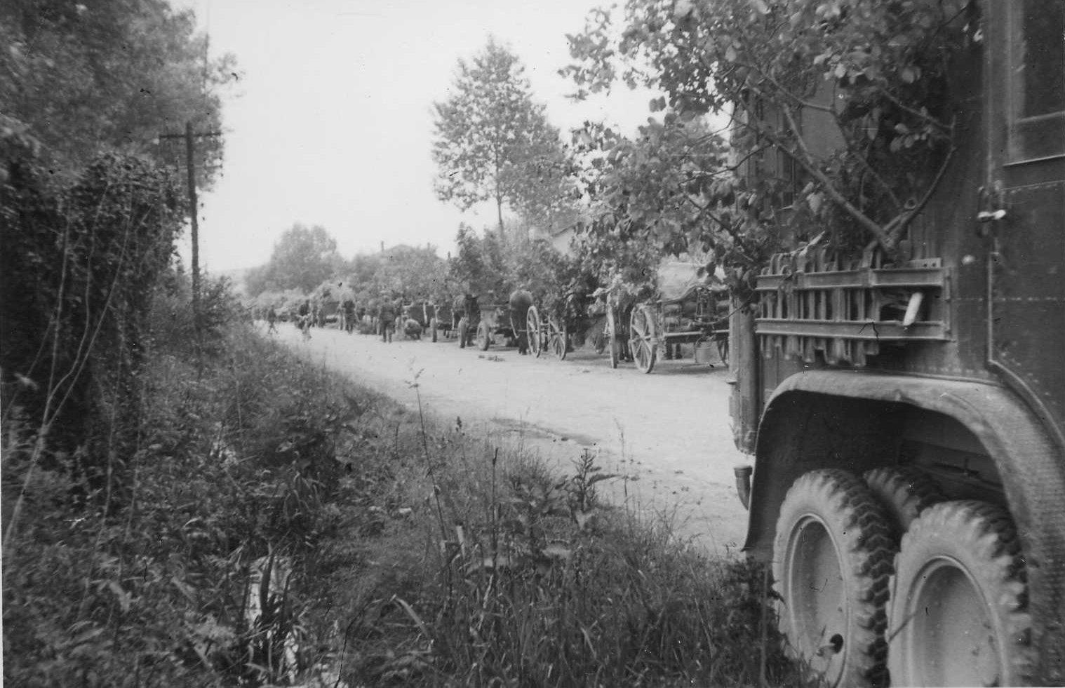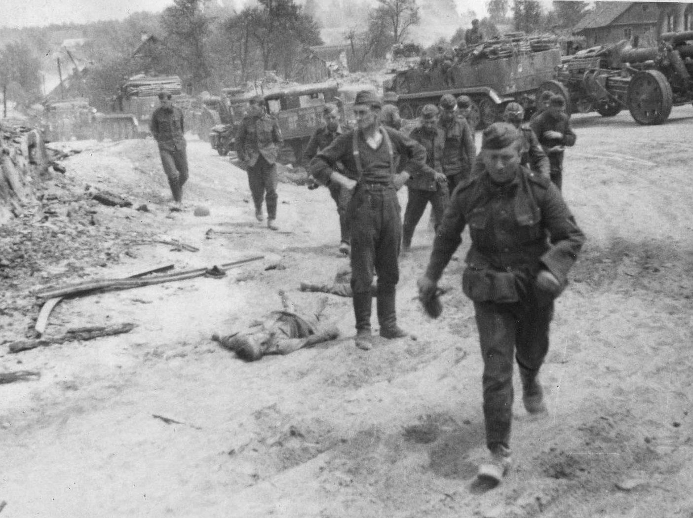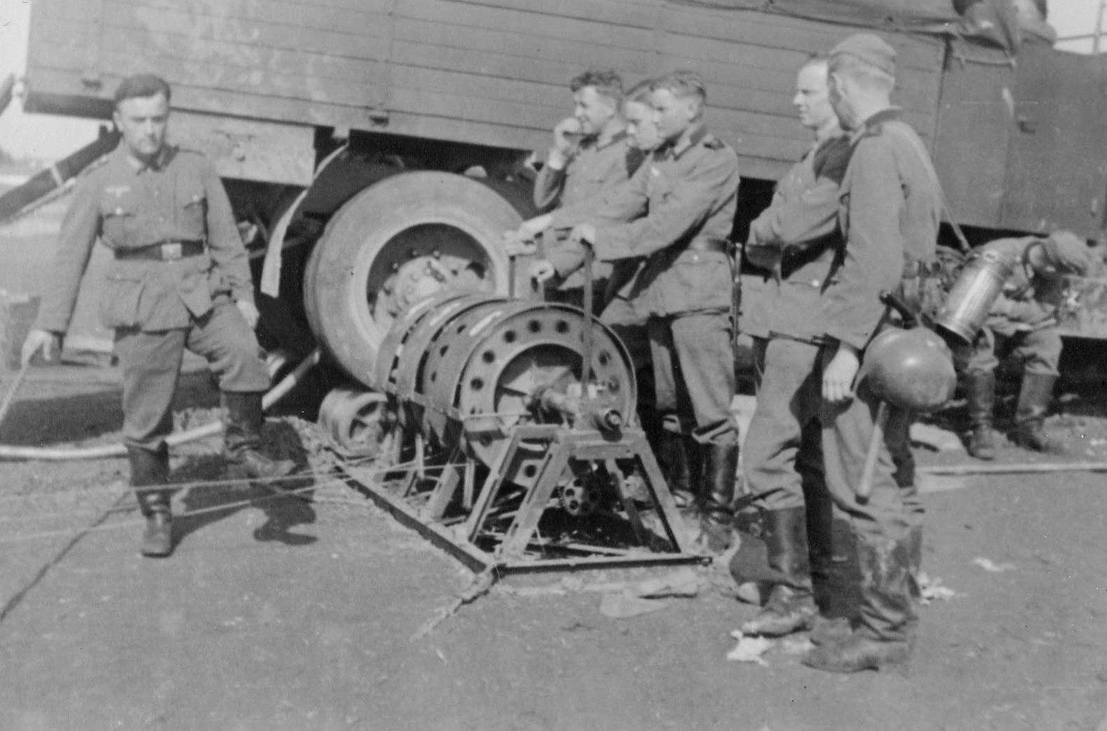 Мост, построенный немецкими сапёрами вместо уничтоженного, чьи быки видны на заднем плане.