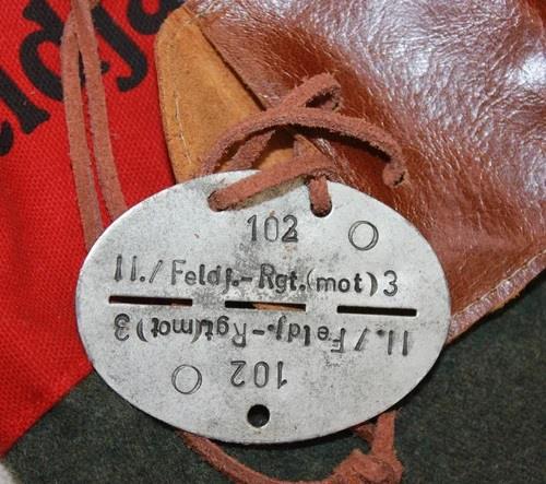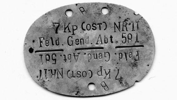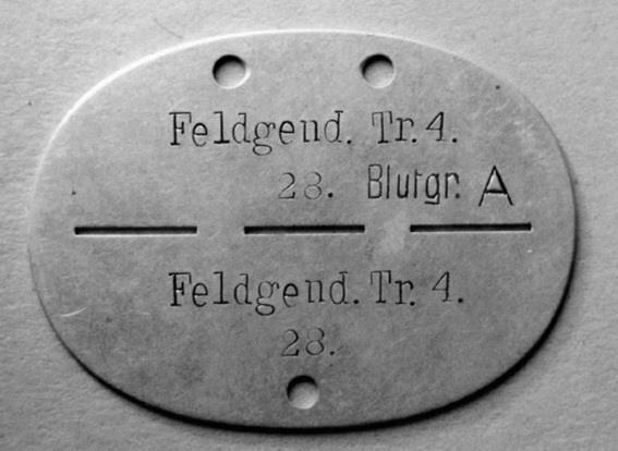 Служебный жетон Feldgendarmerie. На диске записаны: название подразделения, личный номер военнослужащего в списках части и группа его крови.