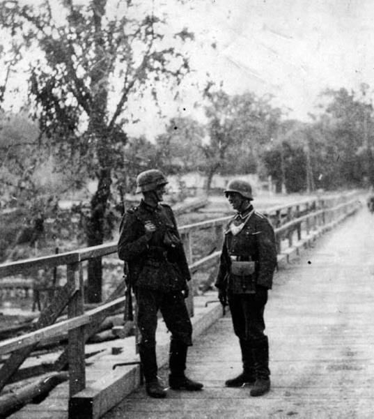 Фельждандармы охраняют небольшой мост. Обратите внимание на планшет для карт у старшего патруля.