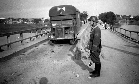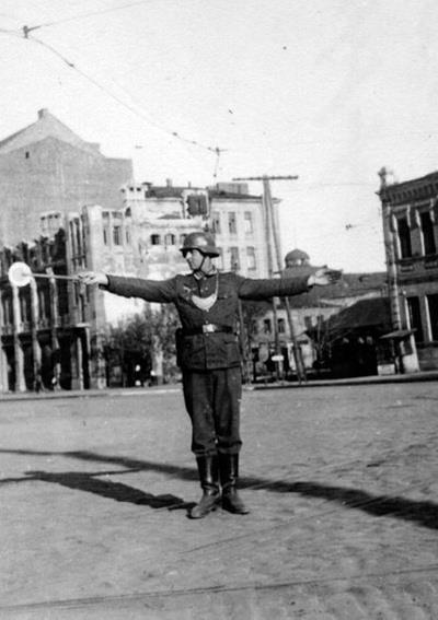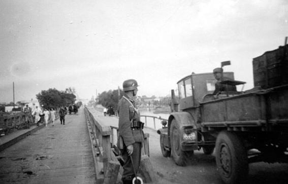 Фельджандарм регулирует движение по мосту. Украина, 1941 год.