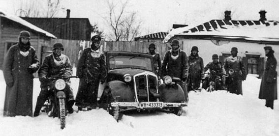 Секция (отделение) фельджандармерии с мотоциклами и реквизированным гражданским легковым автомобилем.