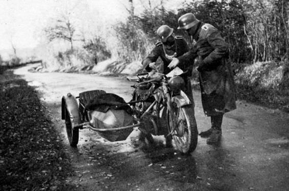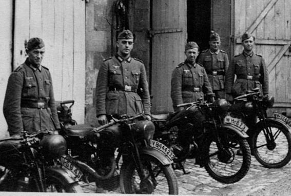 Фельджандармы у своих мотоциклов. У двух слева по-прежнему сохранились гражданские регистрационные знаки, в то время как у двух справа уже армейские с префиксом сухопутных войск ‘WH’ (Wehrmacht Heer).