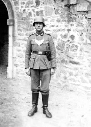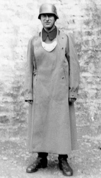 Небольшие размеры кобуры, висящей на ремне этого жандарма говорят о том, что он вооружен не стандартным армейским пистолетом вроде P.08 or P.38, а более компактным образцов типа Walther PP or Mauser HSc.