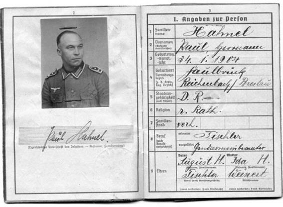Военный билет штабс-фельдфебеля Пауля Ханеля (Stabsfeldwebel Paul Hahnel) из Feldgendarmerie Trupp 833.