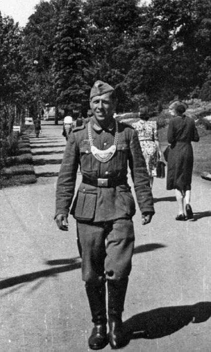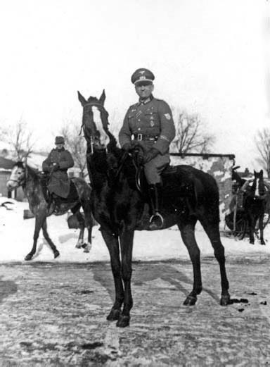Офицер полевой жандармерии верхом на лошади. На Восточном фронте кони стали использоваться значительно чаще, чем в Европе.