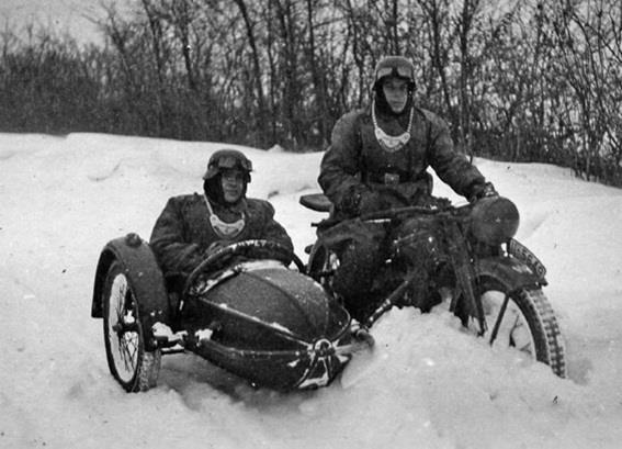 Мотоцикл с коляской Feldgendarmerie-Trupp 468, обратите внимание на крепления для транспортного контейнера в передней части коляски.