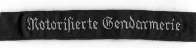 Нарукавная повязка Моторизованой Жандармерии «Motorisierte Gendarmerie» многие из сотрудников которой позже перешли в Полевую Жандармерию (Feldgendarmerie).